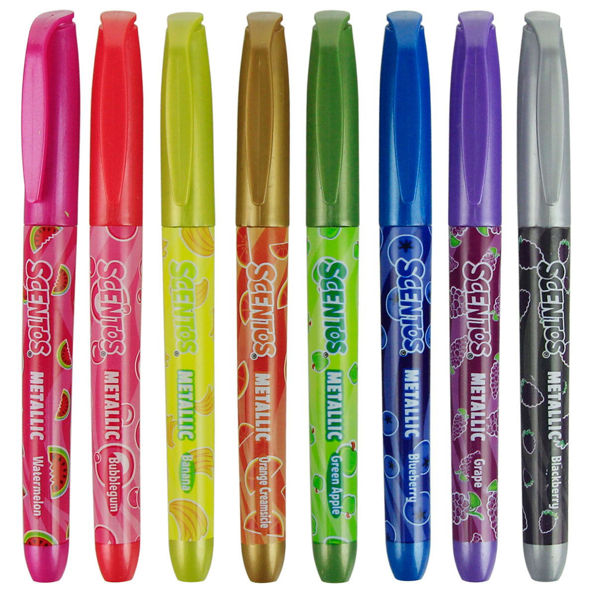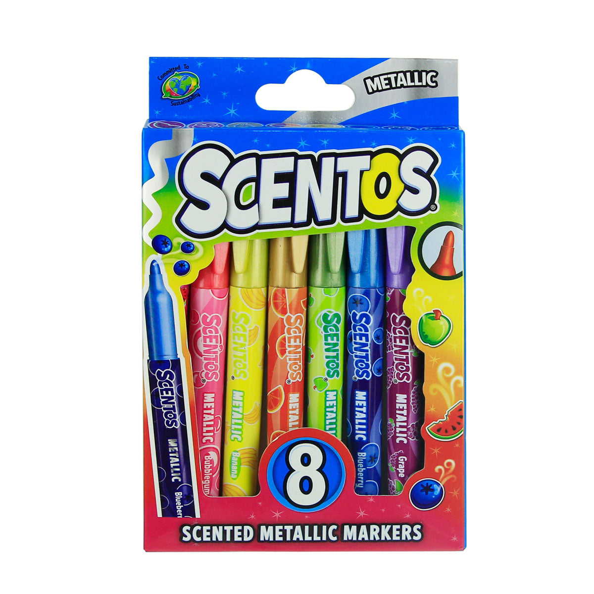 Забавни и креативни ароматни маркери Scentos металик, които правят рисуването още по-вълнуващо. С фини върхове за удобно рисуване и палитра от основни цветове, те съчетават яркост и уникални аромати, за да вдъхновяват всяко дете.
