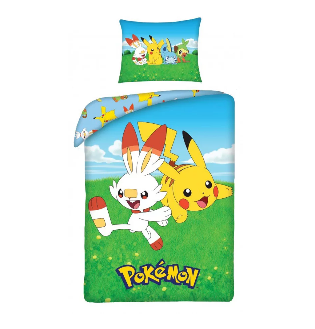 Потопете се във вълнуващия свят на Pokémon с този цветен и забавен спален комплект! Подходящ за всички млади треньори, които мечтаят за приключения с Пикачу и стартовите покемони от региона Галар – Скрбъни, Груки и Собъл.
