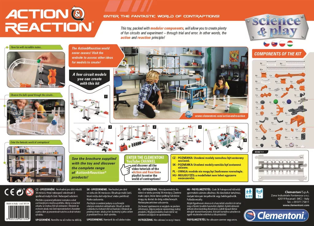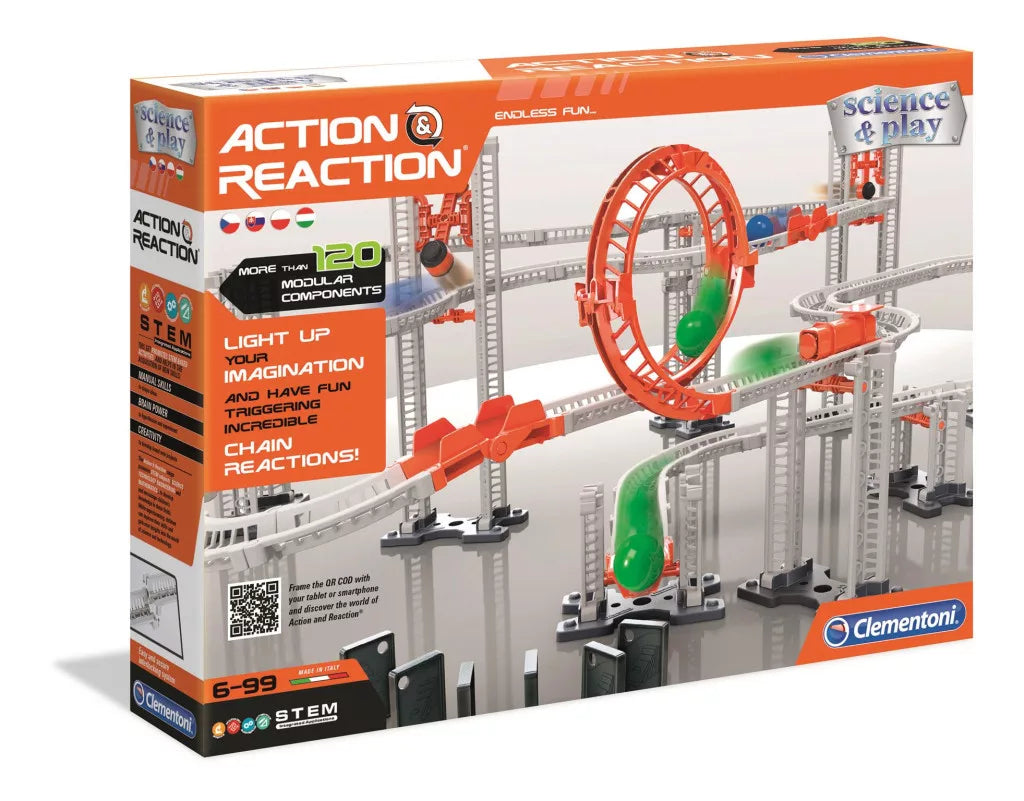 Открий тайните на физиката чрез игра с този впечатляващ научен комплект Clementoni Action-Reaction. С повече от 120 модула можеш да изграждаш собствени трасета, където търкалящите се топчета задвижват поредица от елементи. Следвай стъпка по стъпка илюстрованите инструкции или развихри въображението си и създай уникални конструкции.