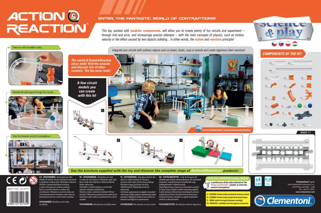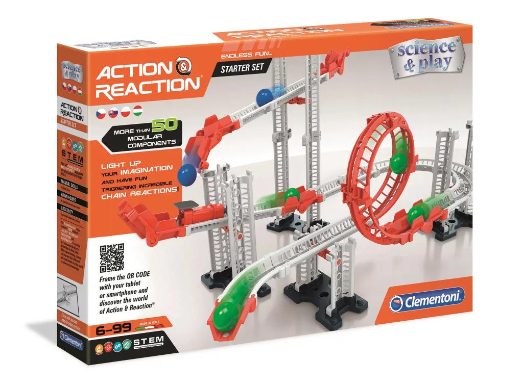 Открий принципите на физиката по забавен и достъпен начин с този впечатляващ научен комплект Clementoni Action-Reaction Beginner. С повече от 50 модула децата могат да изграждат различни трасета, където топчета задвижват елементи едно след друго. Създавай по стъпка по стъпка с ръководството или развихри въображението си и измисли свои конструкции.
