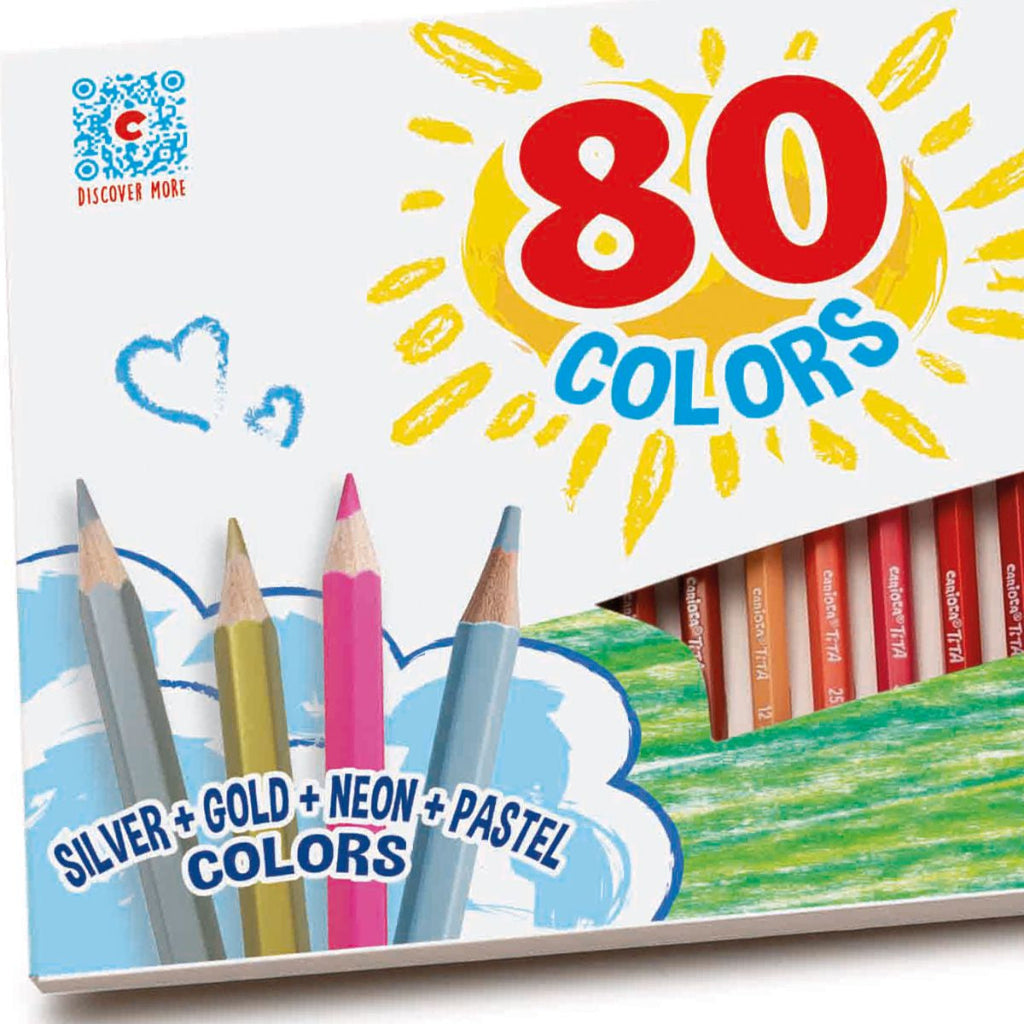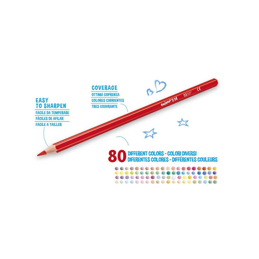 Открий света на цветовете с впечатляващия комплект Carioca Tita, съдържащ цели 80 нюанса! Сред тях ще откриеш златни, сребърни, неонови и пастелни тонове, идеални за всякакви креативни проекти. Моливите са лесни за острене и осигуряват плавно и наситено рисуване.