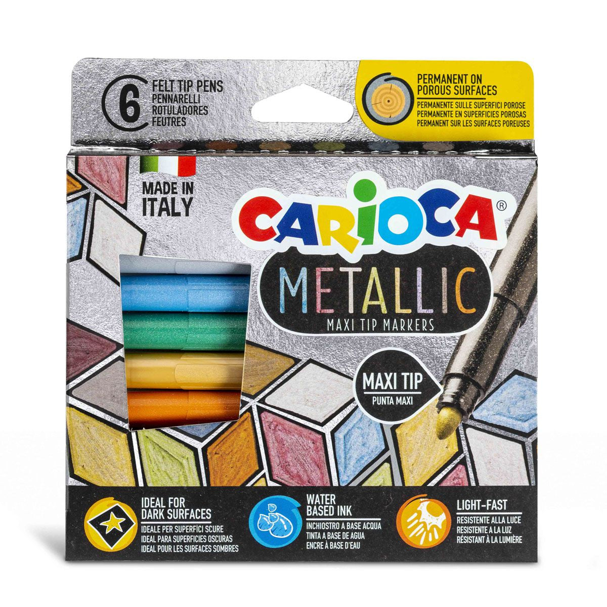 Придай блясък и стил на всяко творчество с маркери Carioca Metallic. С мастило на водна основа и фиксиране с акрилен емайл, те осигуряват дълготраен ефект и пишат върху всякакви повърхности. Идеални за черни картони и специални проекти.