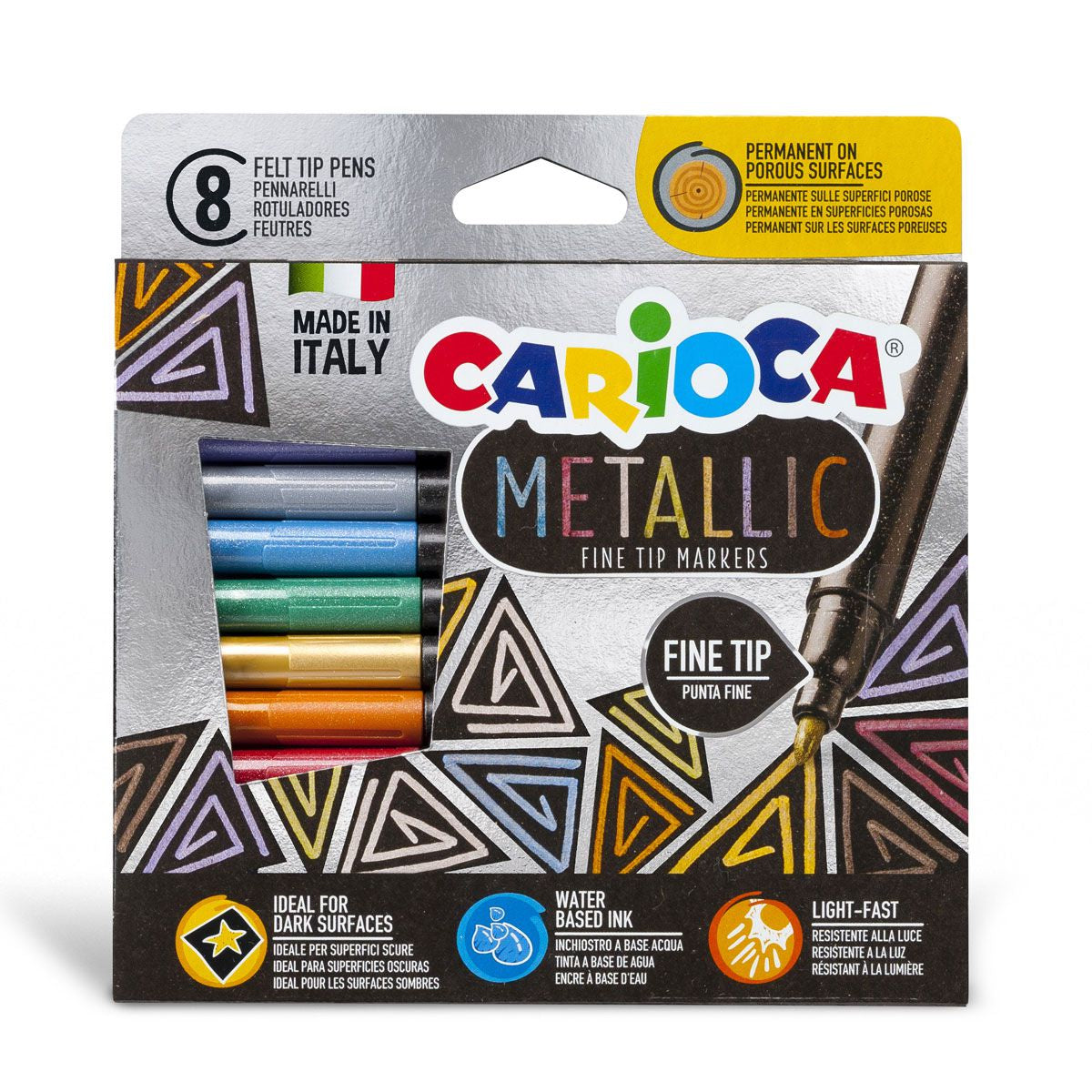 Добави блясък и стил към своите проекти с металик флумастерите Carioca! Създадени за впечатляващи ефекти, те са идеални за рисуване върху тъмни картони, особено върху черен перлен картон, където цветовете изглеждат изключително наситени и ефектни.